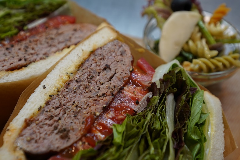 つなぎを一切使わずに作る「鳥茂」のつくねを、「パンのペリカン」の食パンで挟んだサンドイッチ。