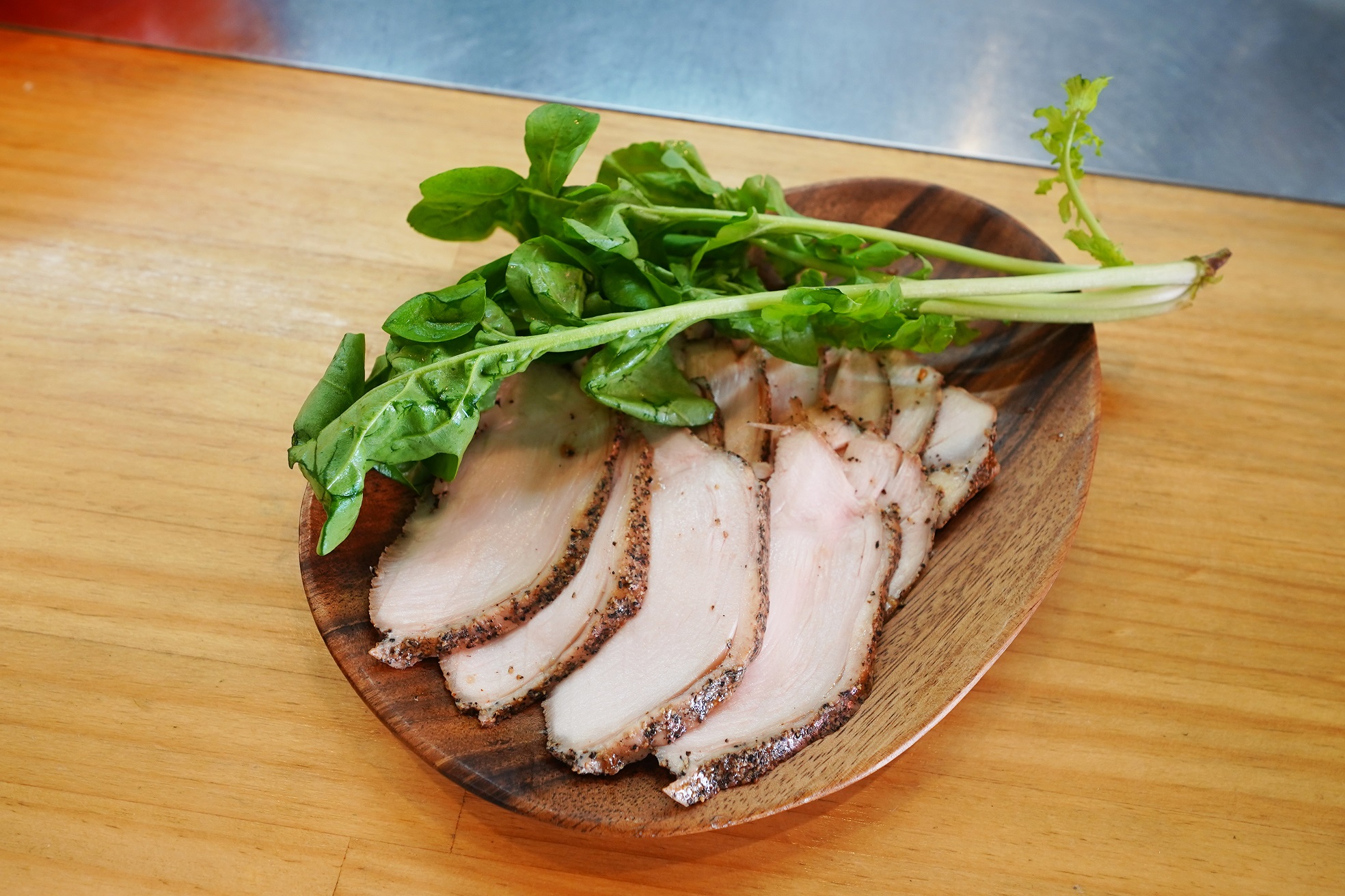ブラックペッパーをふりかけたチキン(胸肉)を、低温調理でしっとりとやわらかく仕上げ、ほんのり苦味のあるルッコラと合わせています。1人前約6枚500円(税抜き)で販売開始。