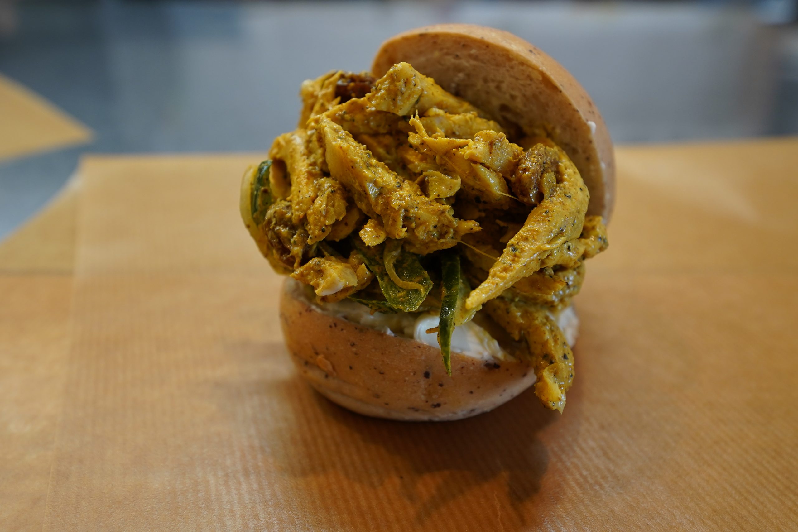 当店の人気メニューのひとつ、たっぷり野菜がうれしいチキンサラダをミニバーガーにしてみました。
