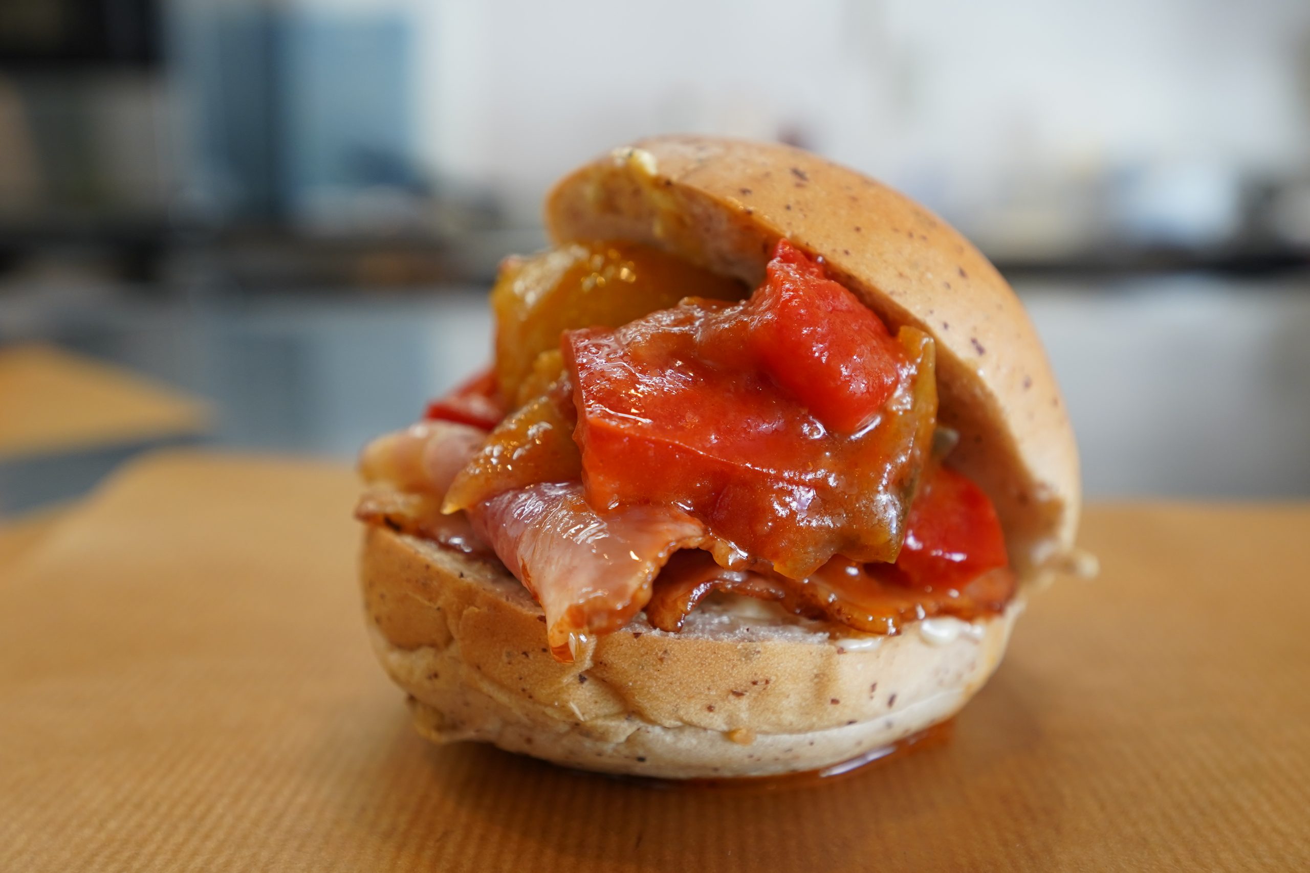 野菜本来の味を生かしたラタトゥイユをかもめパンのバンズで挟めば、また新たな美味しさと出会うことができますよ。ベーコンもたっぷり!