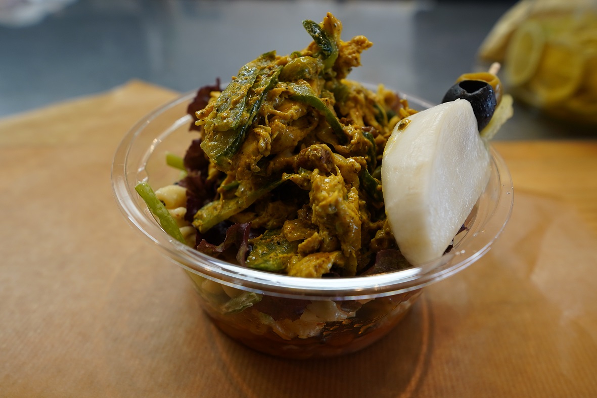下から「ラタトゥイユ」「パスタサラダ」「チキンサラダ」。そして一番上には、アクセントととしてカブとオリーブのピクルスが添えられています。