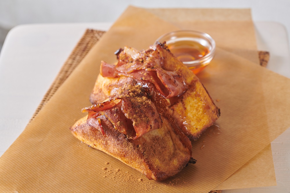 フレンチトースト&ベーコンは、甘さ控えめでベーコンつきなので、食事にも最適! シナモンとメープルシロップをかけてどうぞ。